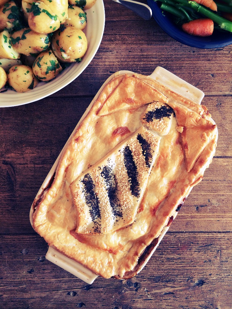 7 Brush the ‘tie’ with the beaten egg and decorate with the poppy and sesame seeds, then brush the ‘shirt’ with the remaining egg and place on a baking sheet and bake for 30-35 mins until the pastry is golden. Serve with the steamed vegetables.
