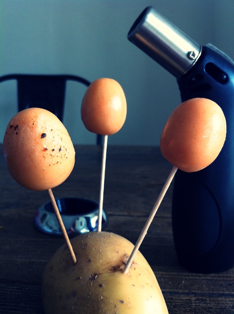 7 It’s all in the detail. Pick 3 eggs and give them an ultra realistic touch, insert cocktail sticks into the base of each, then push into half a potato to keep them steady, brush with beaten egg, then blow torch to create a speckled effect.