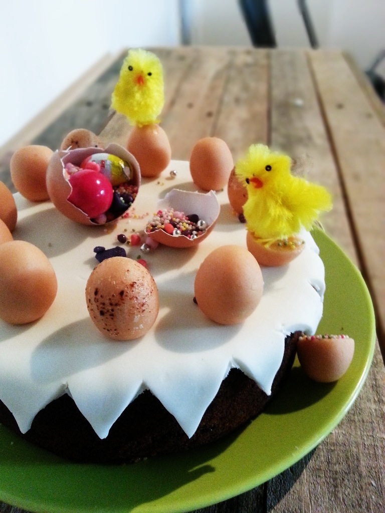 8 Place all the eggs around the cake, use a little cooled boiled water at the base to help them stick if needed, place the egg shell in the middle and spoon in the cake decorations and chocolates. Finally decorate with Easter chicks.