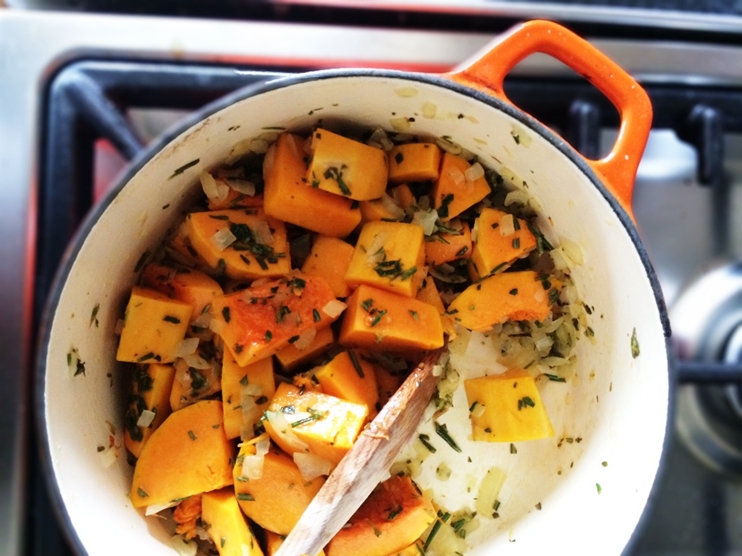 2 Heat the remaining oil in a large, deep flameproof casserole over a medium heat, cook the onion for 5 mins, then add the squash and remaining herb mixture and cook, stirring occasionally, for a further 5 mins. Remove from the heat.