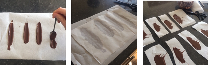 For the chocolate curls, spoon strips of melted good quality dark chocolate onto a square of baking parchment, lay another sheet on top, lightly run your finger along the chocolate strips. Remove the top sheet. Cut into individual strips.
