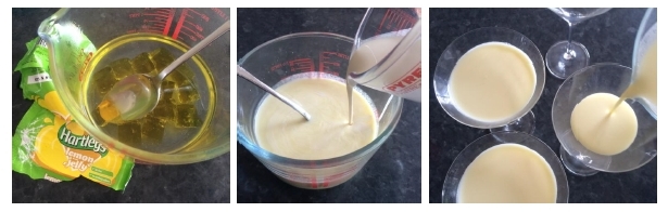 For the pannacotta, place the cubes from 1 pack of lemon jelly in 250ml of just boiled water, stir until dissolved (if it needs a helping hand, heat in the microwave for 30secs). Leave to cool to room temperature, then top up with 285ml double cream. Pour into 4 glasses and chill to set.