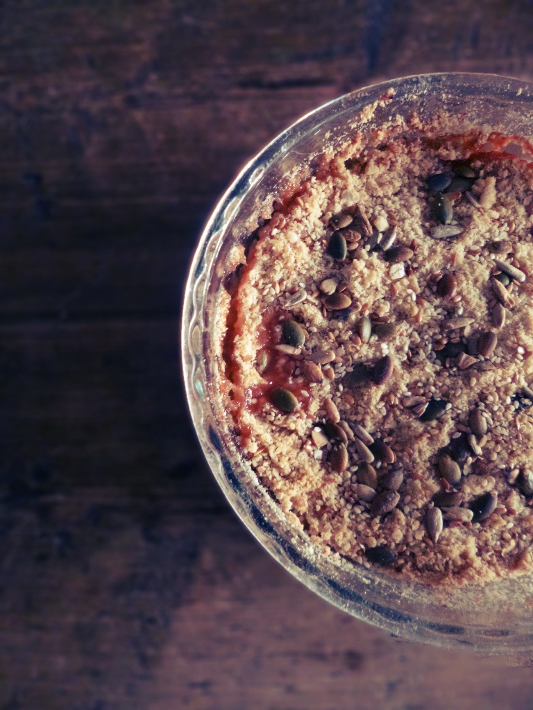 2 For the crumble, put the flour and butter in a bowl, rub between your fingertips to create a mixture that resembles breadcrumbs. Stir in the oats and Demerara sugar, then spoon over the rhubarb mixture. Scatter over the seeds to decorate.