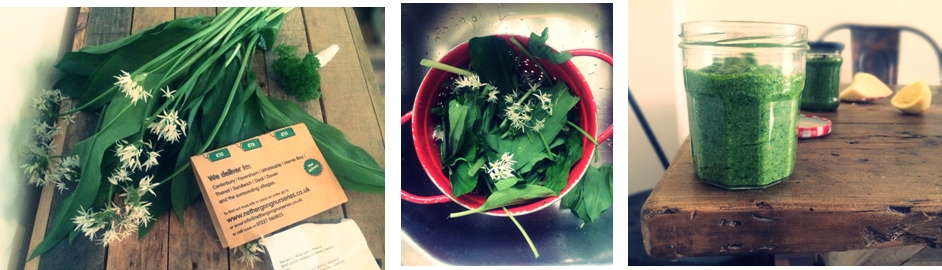 In a food processor, blitz 1 large bunch washed wild garlic with 1 small bunch of curly parsley, 60g toasted pine nuts and 60g grated Parmesan for a minute or two then slowly pour in 150ml olive oil until blended. Makes approx 2 jars.