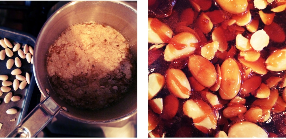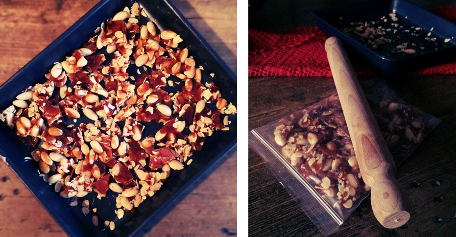 2 Cook, without stirring, on a medium heat until the sugar melts and turns a light golden colour. Add the almonds and carry on cooking for 1 min. Pour on to an oiled baking sheet and leave to cool and set. Roughly break up the croquante and put into a plastic bag. Bash with a rolling pin to break up.