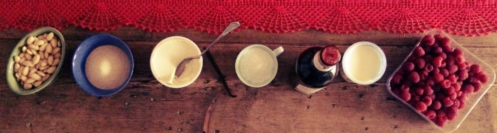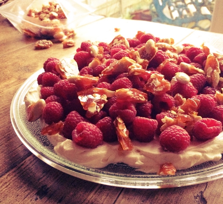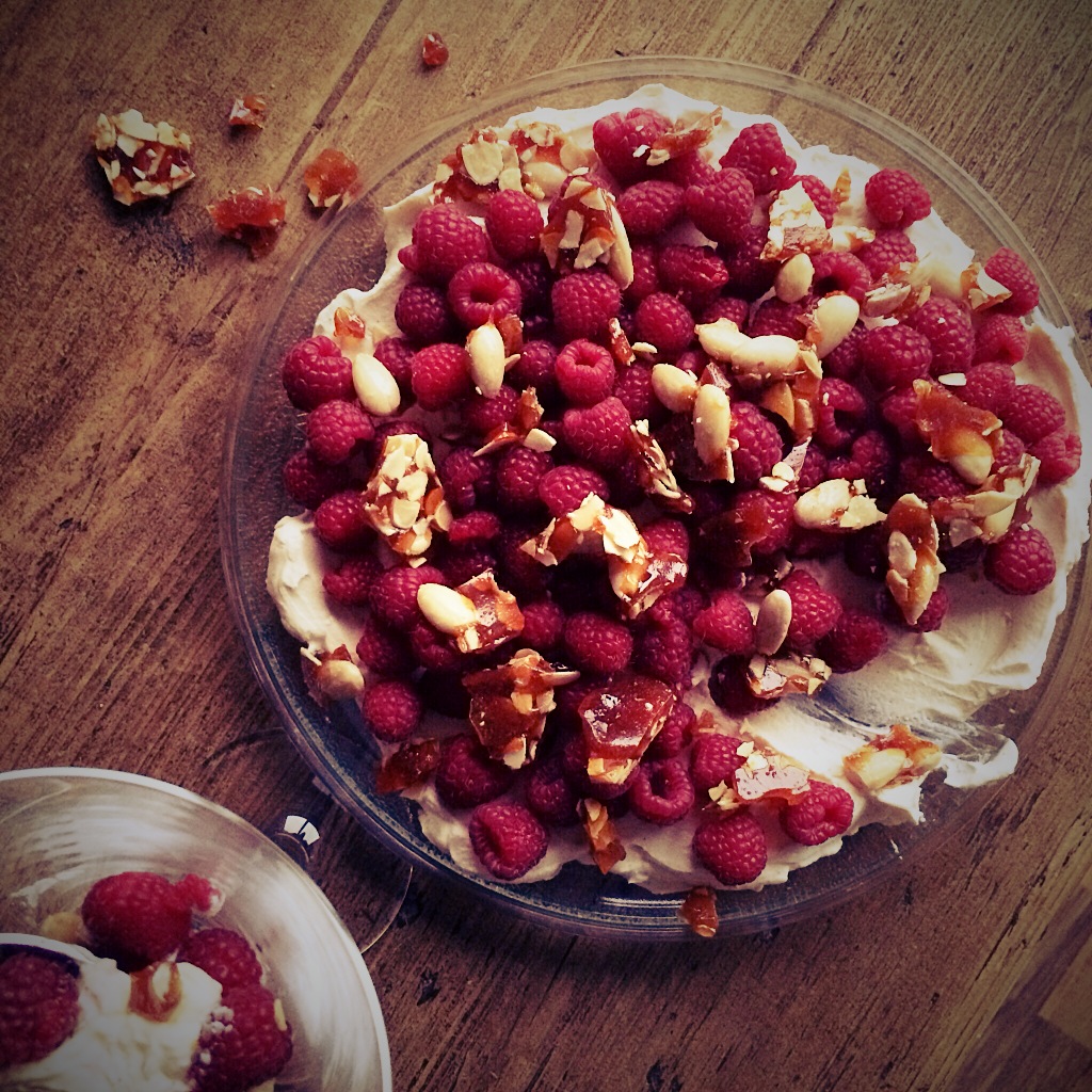 4 Spoon the crema di mascarpone on to a serving dish. Scatter over the raspberries and sprinkle with almond croccante.